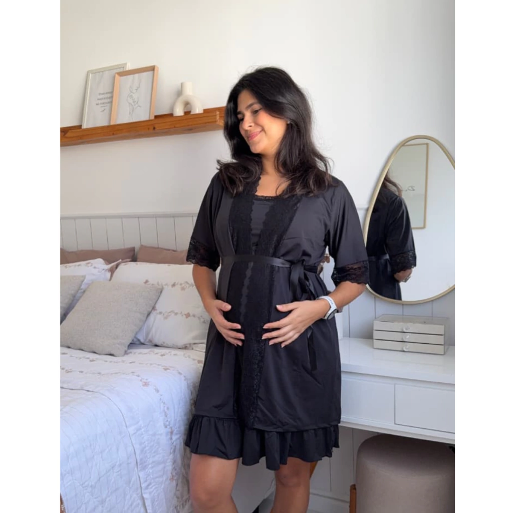 Kit delicado e funcional para a sua amamentação. A camisola possui abertura completa e fecho em click para facilitar a amamentação, detalhe rendado no busto. O comprimento vai até abaixo da coxa.
