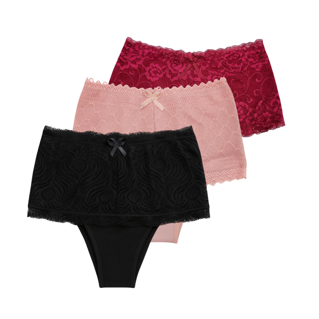 Descubra a delicadeza e conforto com o nosso Kit com 3 Calcinhas Renda. Cada peça é cuidadosamente elaborada com renda totalmente forrada e a parte íntima em 100% algodão, garantindo máximo conforto e nenhum incômodo ou irritação para a sua pele.