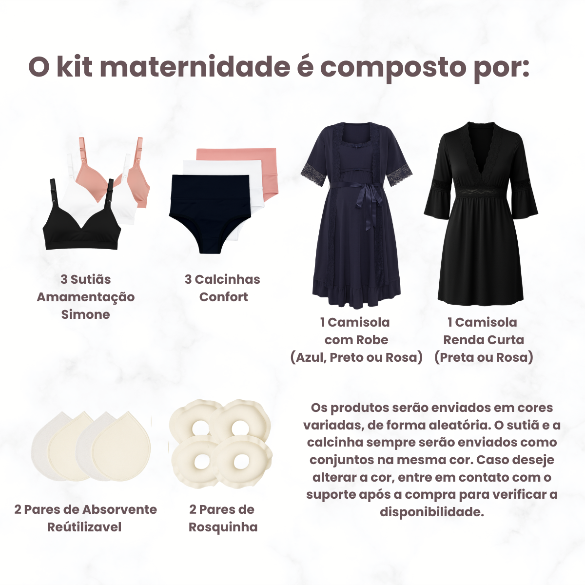 O kit de Sutiã e Calcinha serão enviados em forma de conjuntos em 3 cores diferentes, porém mantendo a mesma cor no conjunto. Exemplo: 1 Sutiã Rosa com 1 Calcinha Rosa - 1 Sutiã Preto com 1 Calcinha Preta - 1 Sutiã Branco com 1 Calcinha Branca.