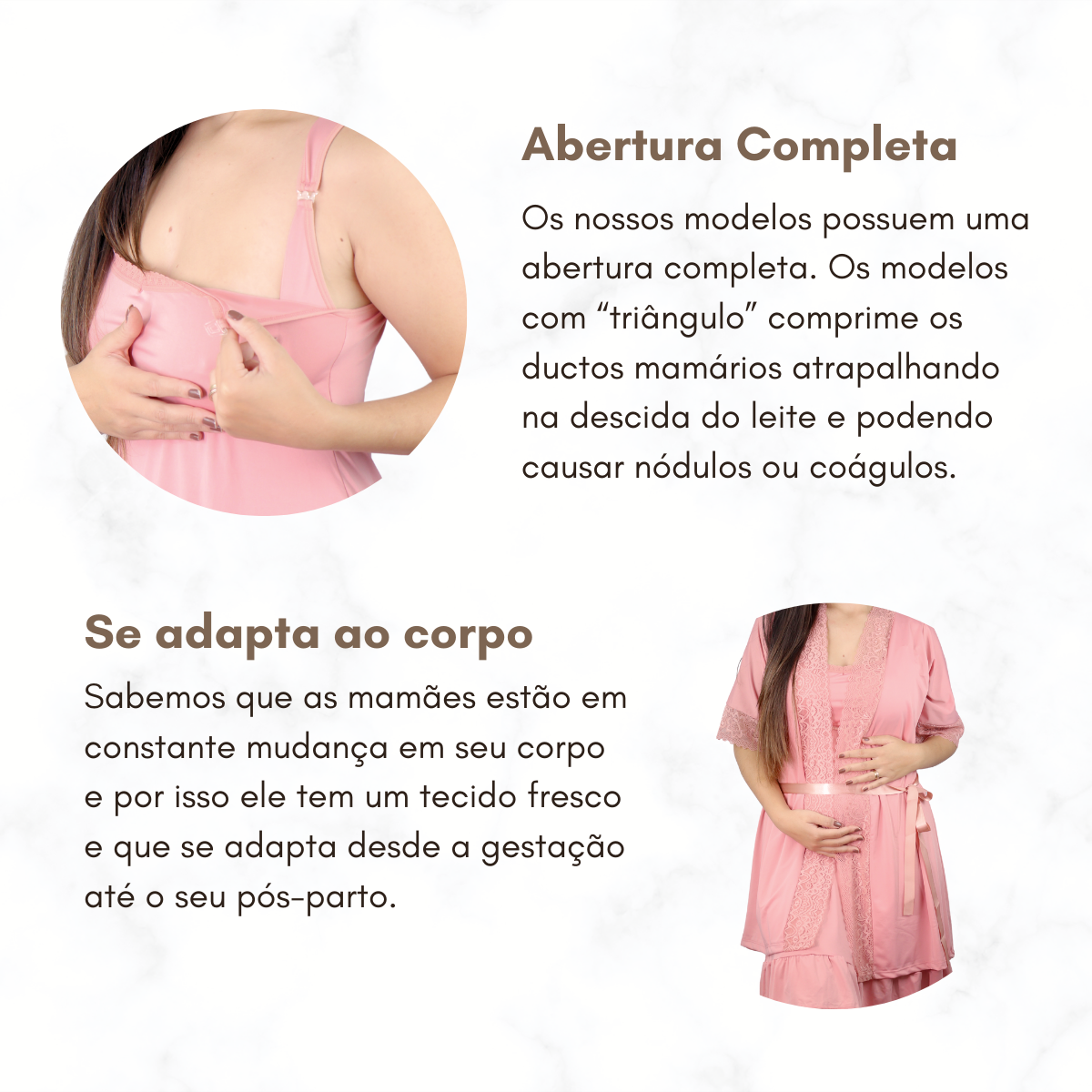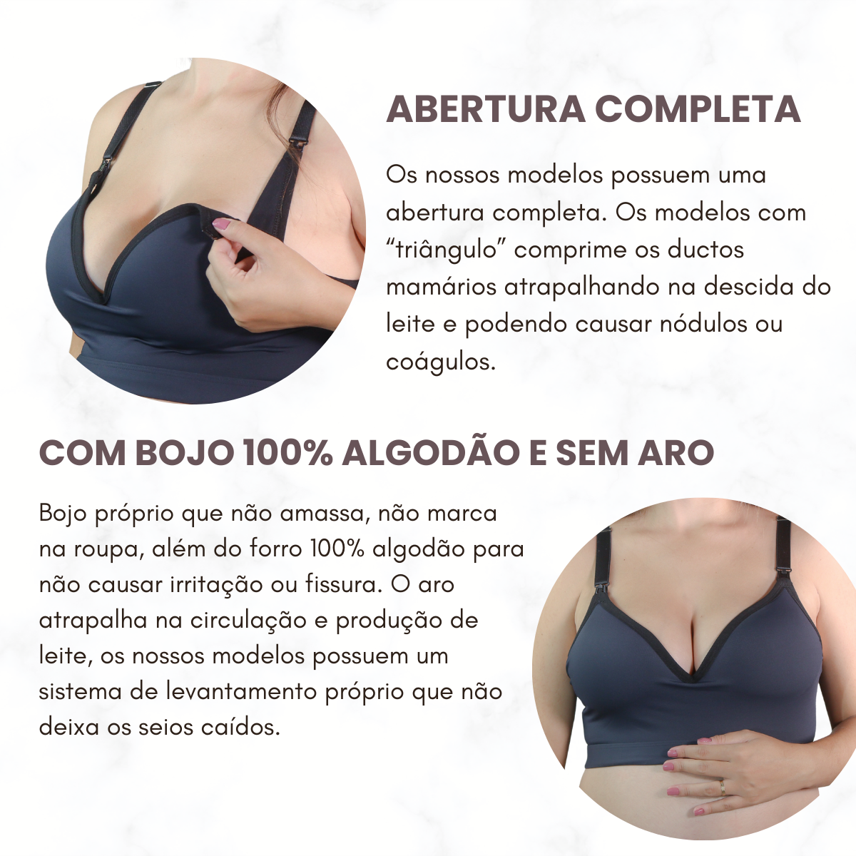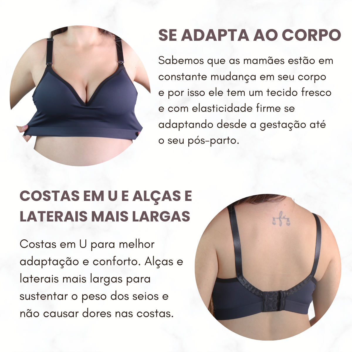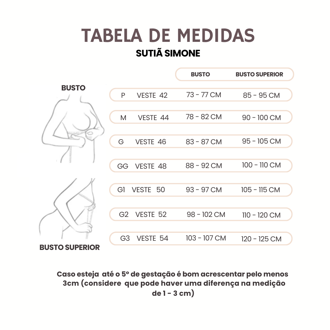 Se está considerando usar no pós-parto, sugerimos escolher um tamanho maior do que o utilizado antes da gravidez para garantir o máximo de conforto durante essa fase especial.