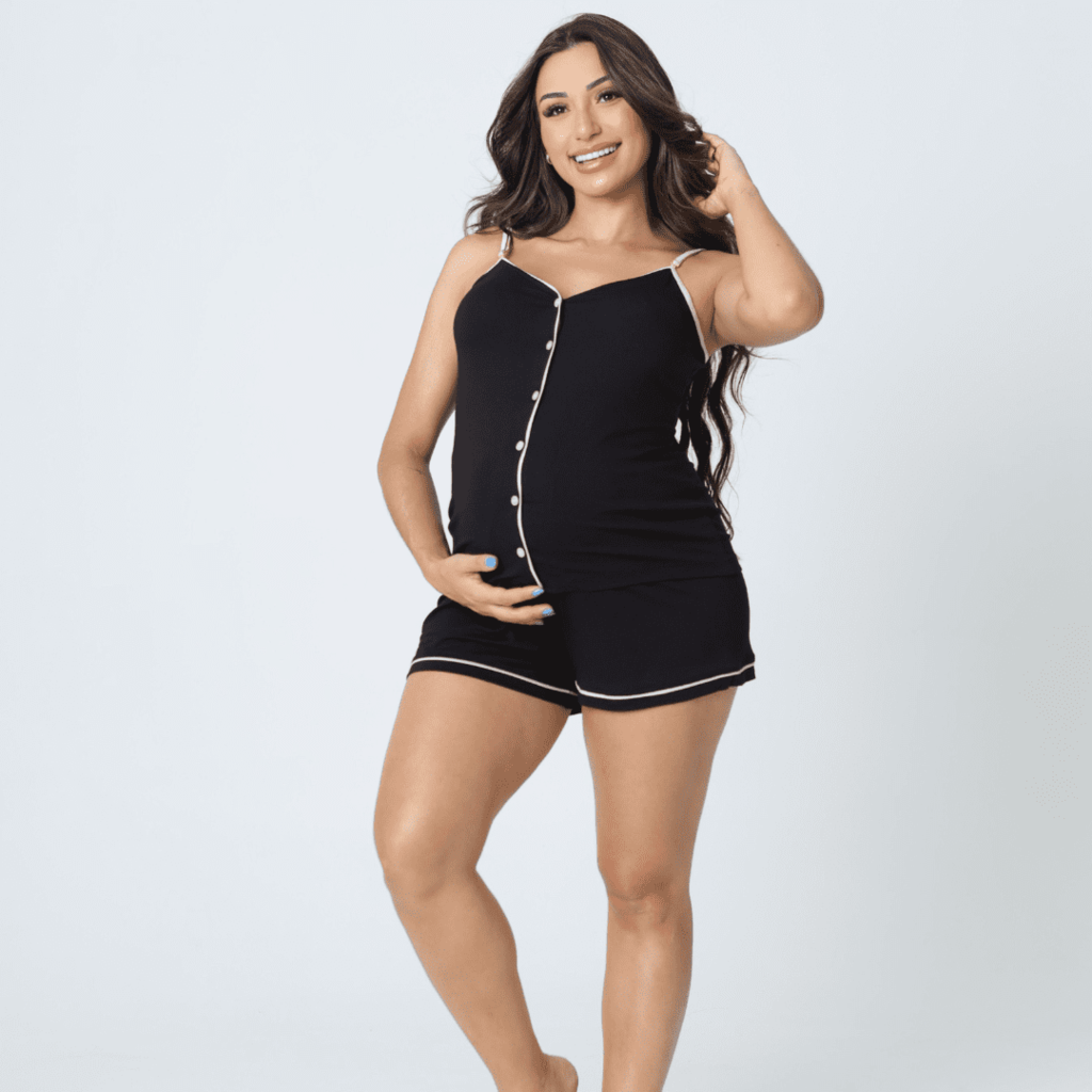Este pijama não só oferece conforto, mas também realça sua beleza, fazendo você se sentir linda e confiante durante esta fase tão especial da sua vida.