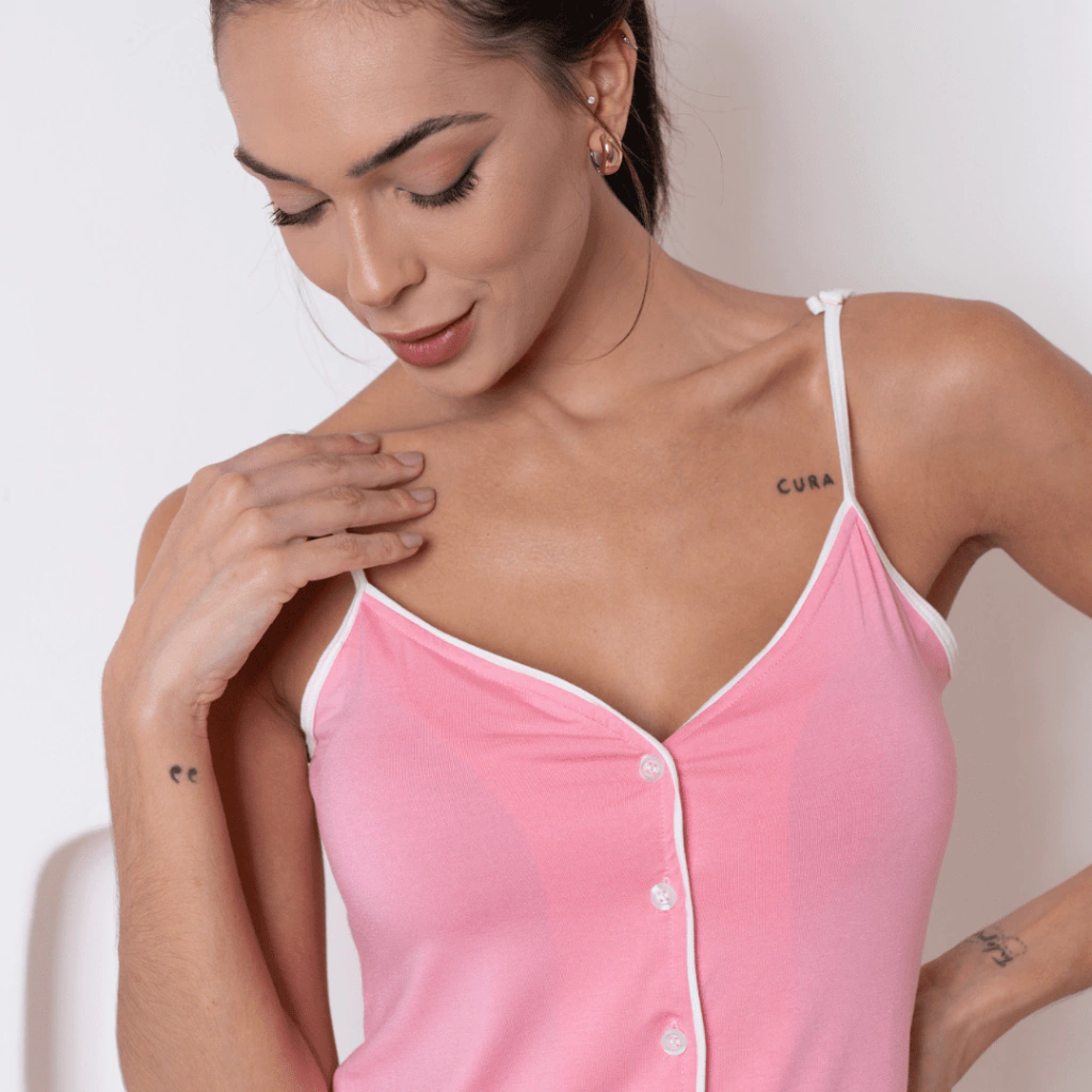 Nosso Pijama Americano com Alças - Rosa é feito de Viscose Premium, garantindo um toque extremamente macio e confortável na sua pele. Ideal para proporcionar bem-estar em momentos especiais.